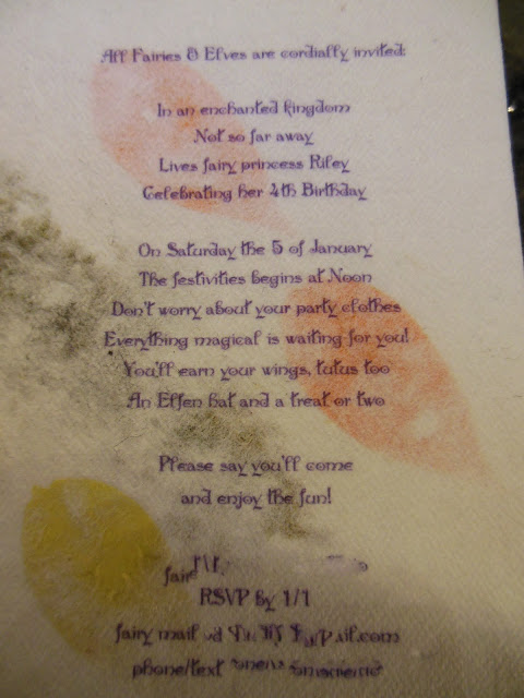 I lucked out at a warehouse sale and found some leaf printed paper invites for super cheap, I think they were 50 for $4! I then printed out in super small fairy sized writing the invitation wording, rolled them up, tied with a bit of tulle & attached a magnifying glass in case the fairy's writing was just too small.
